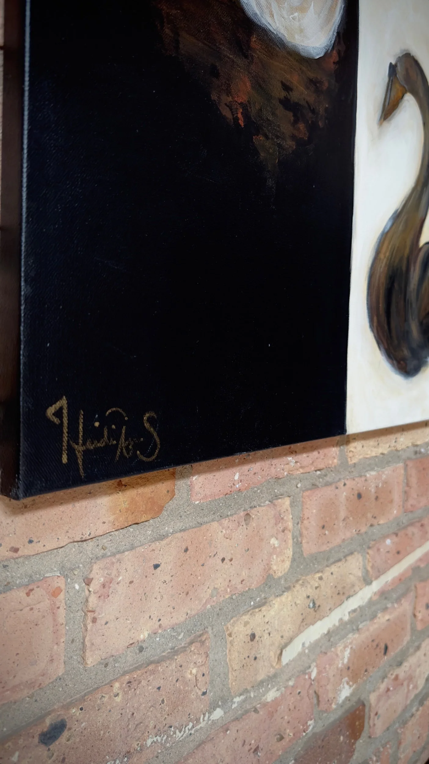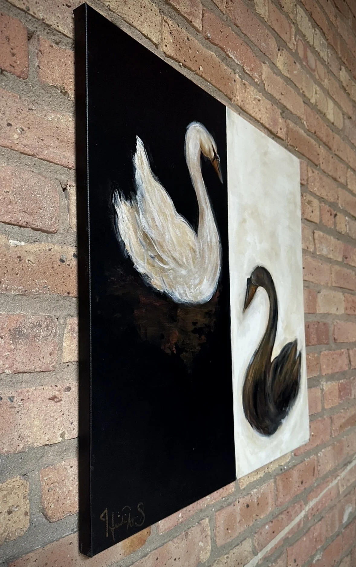 Based on the concept of energetic balance—Yin and Yang—-with a twist. Swans mate for life. Yet they do not cross the line; they do not meet. If they were aligned, they’d be the perfect match, forming a heart between them. Instead, they admire from afar.