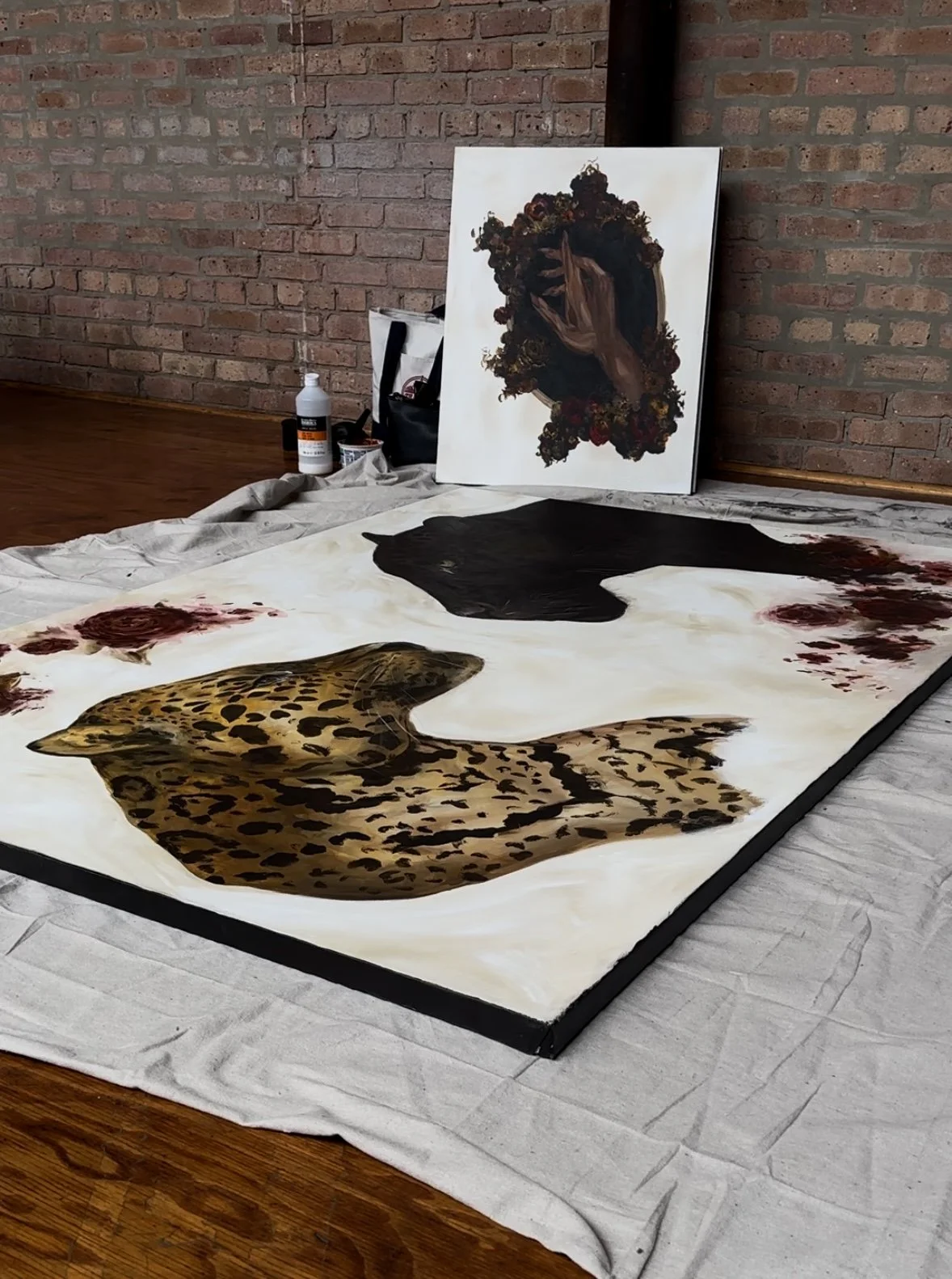 Recognition is the marking of soulmates. A jaguar and panther are similar yet complimentary, just like we are. The eyes say so much without saying anything at all—the look of love. On this sizable canvas, captivation is only the beginning of a beautiful connection.