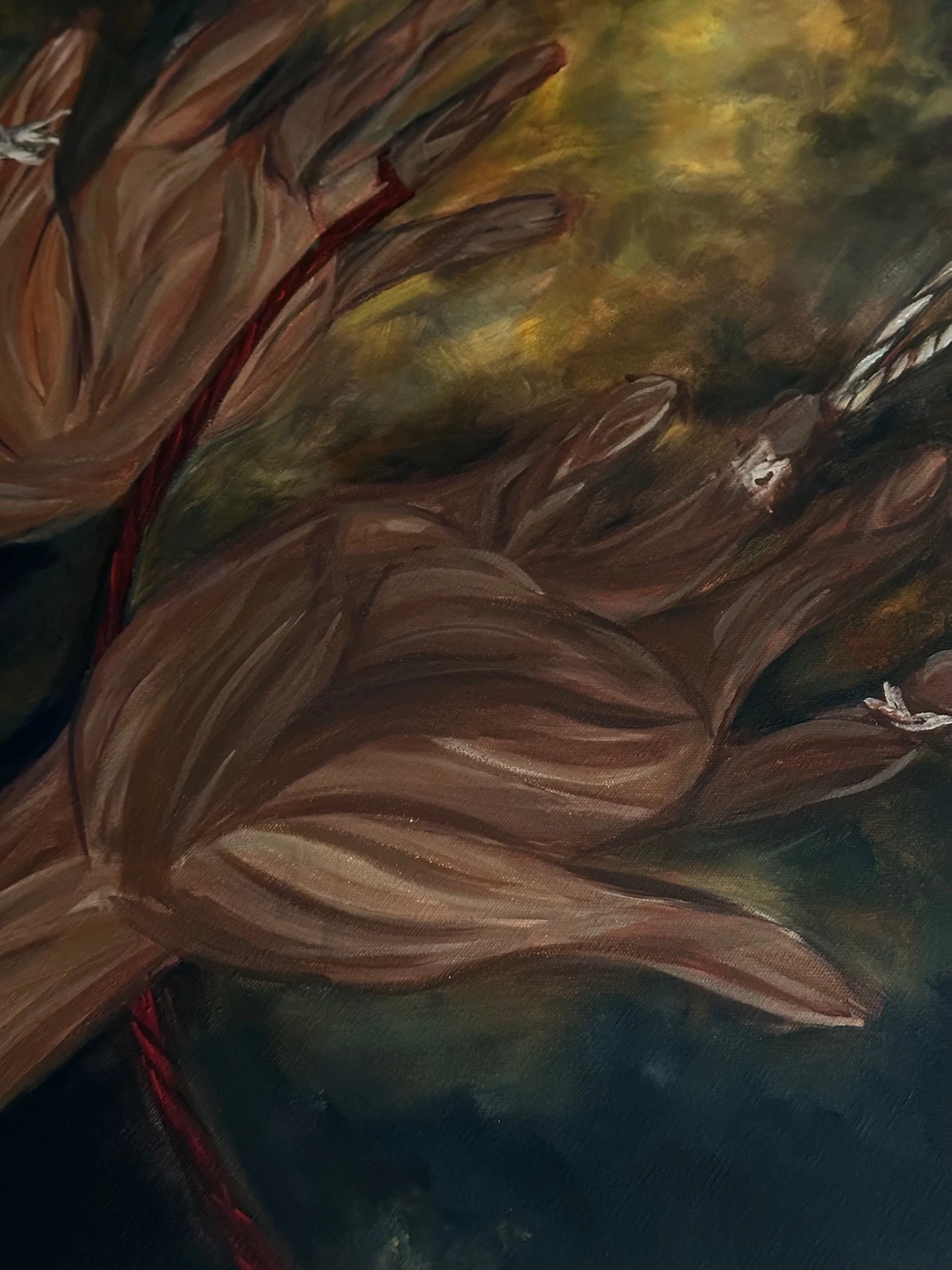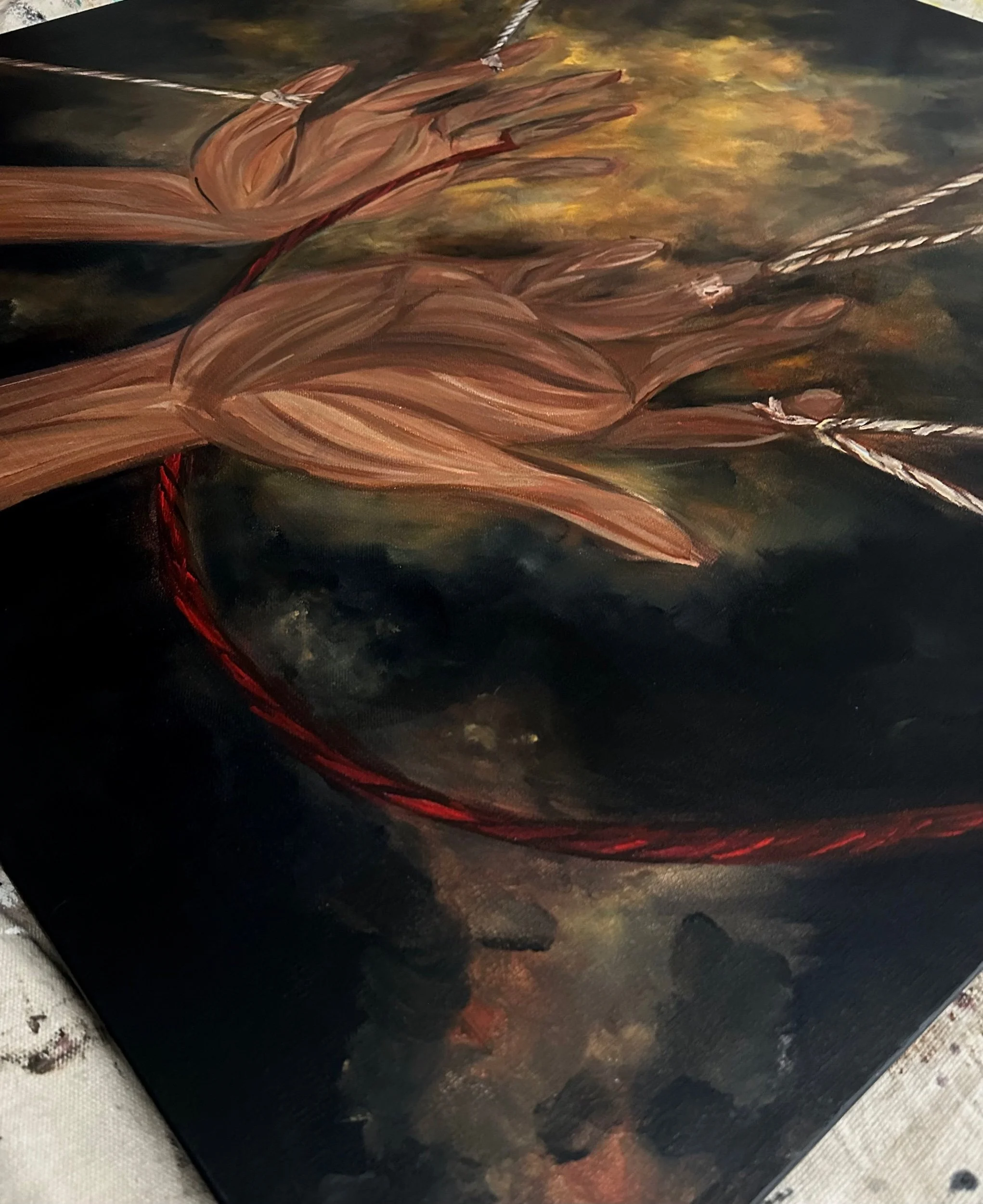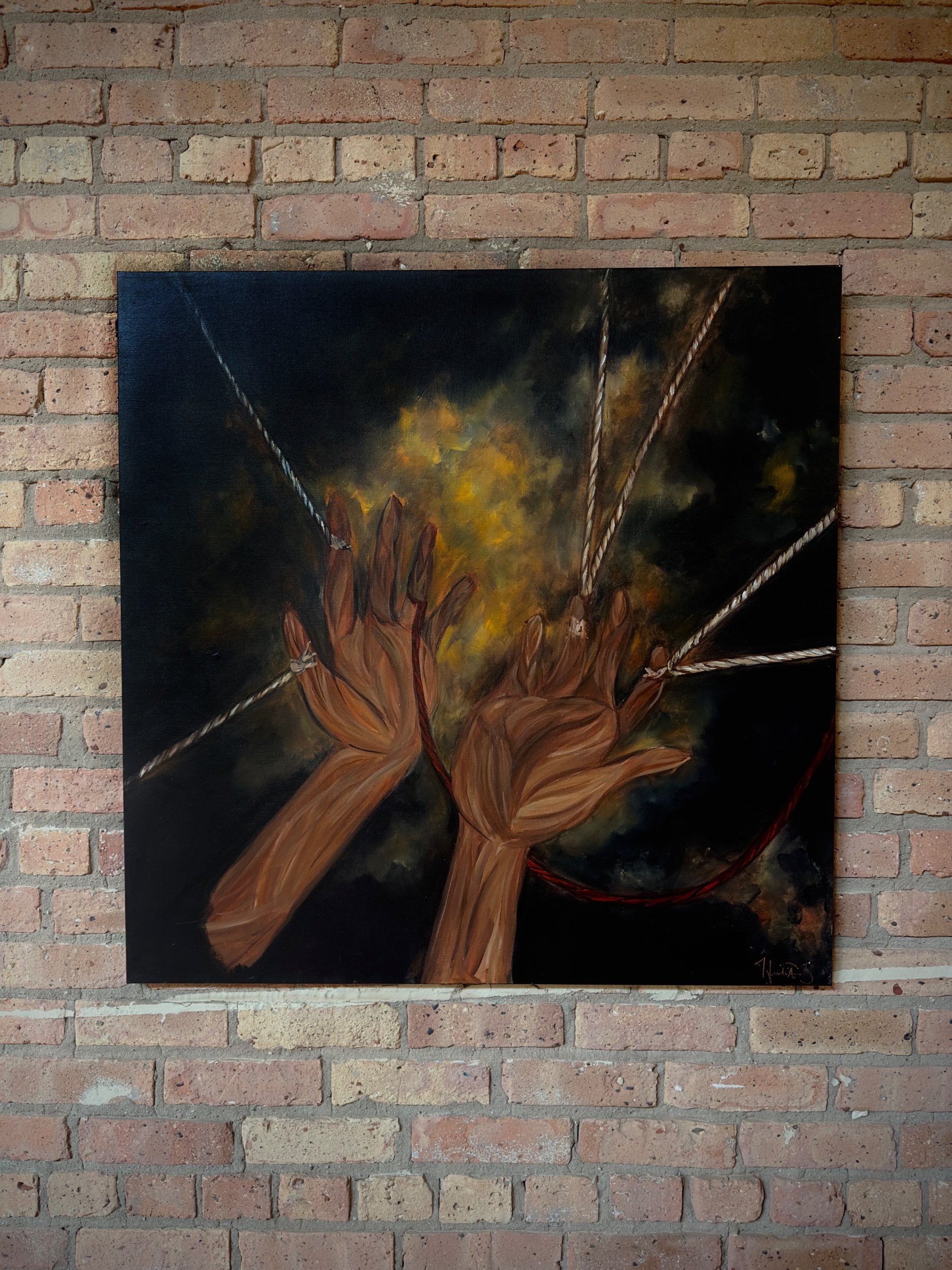 Inspired by the Eastern philosophy of the Red Thread of Fate or Destiny (popularly known as the Red String Theory), this piece asks the viewer to contemplate where our connections are pulling us and which ones we feel bound by.