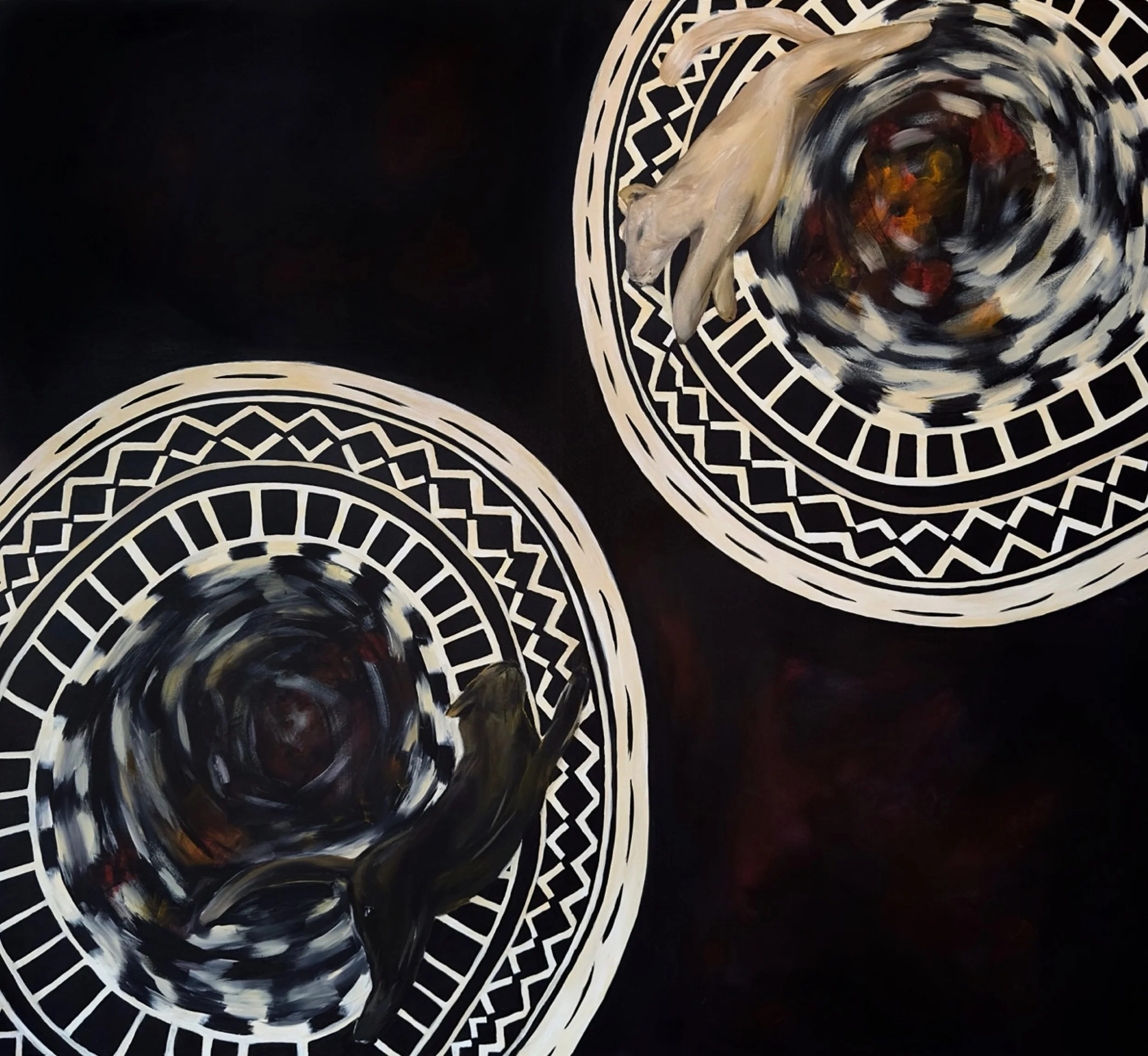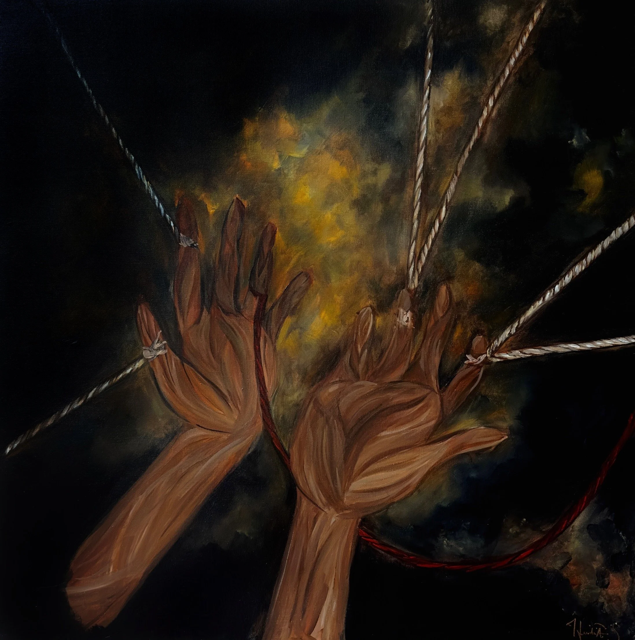 This most recent collection of fine artwork explores spiritual concepts, cultural philosophies, and abstract thoughts regarding our relationships and connections with other people. Using natural and spiritual symbols in these high contrast compositions, the artist depicts concepts of reincarnation, the butterfly effect, the red string theory, and more.